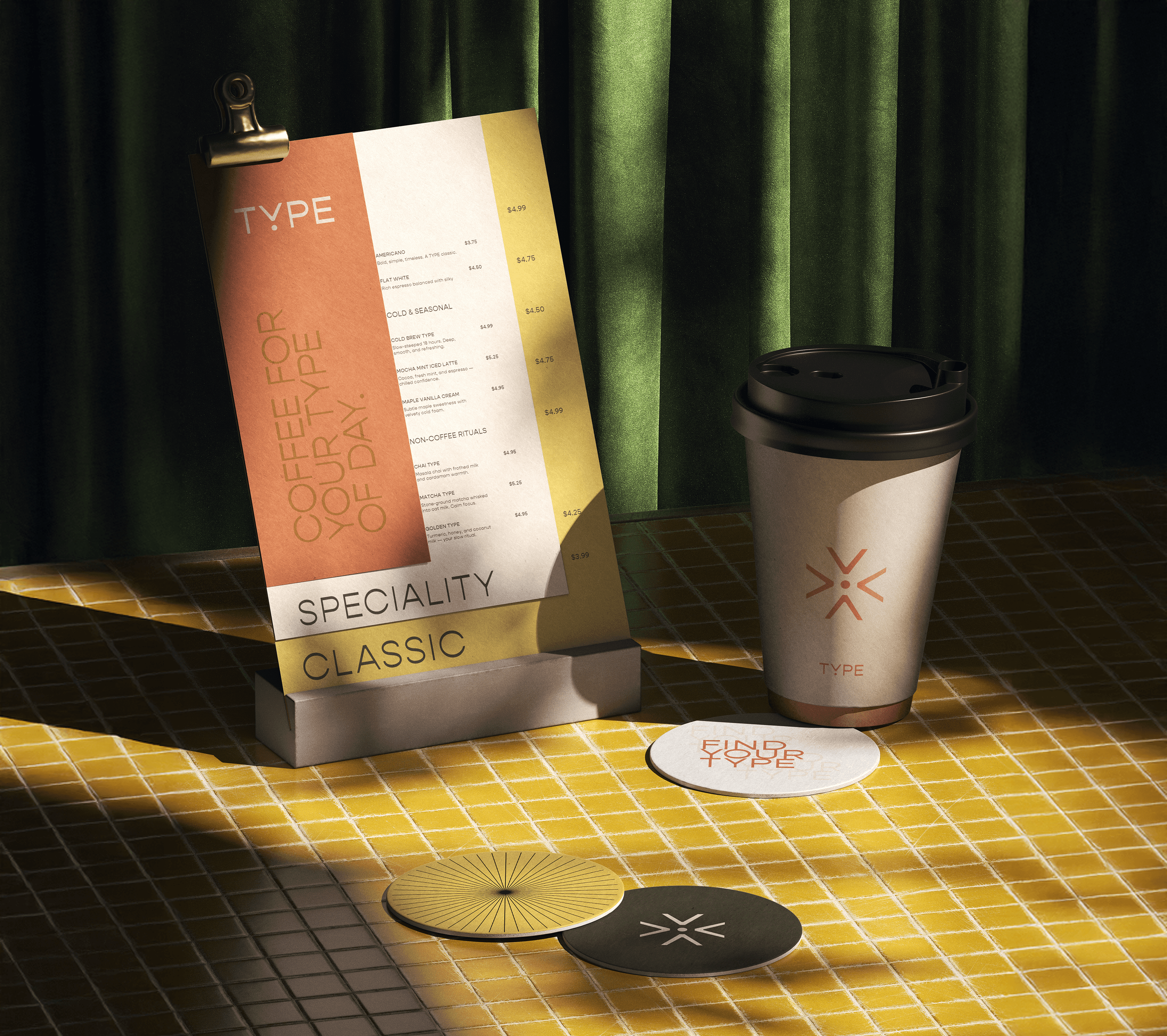 TYPE’s visual identity system is equal parts expressive and systematic — a modular brand built to shift with its audience. From the adaptable logo and color-coded moods to product names and visual elements, every piece flexes without losing clarity. TYPE doesn’t follow trends; it tracks feelings. Whether someone reaches for Bold Type or Chill Type, they’re not just picking coffee — they’re selecting their emotional tone for the moment. That’s what makes TYPE powerful: a brand that’s alive, responsive, and as adaptable as the people it serves.